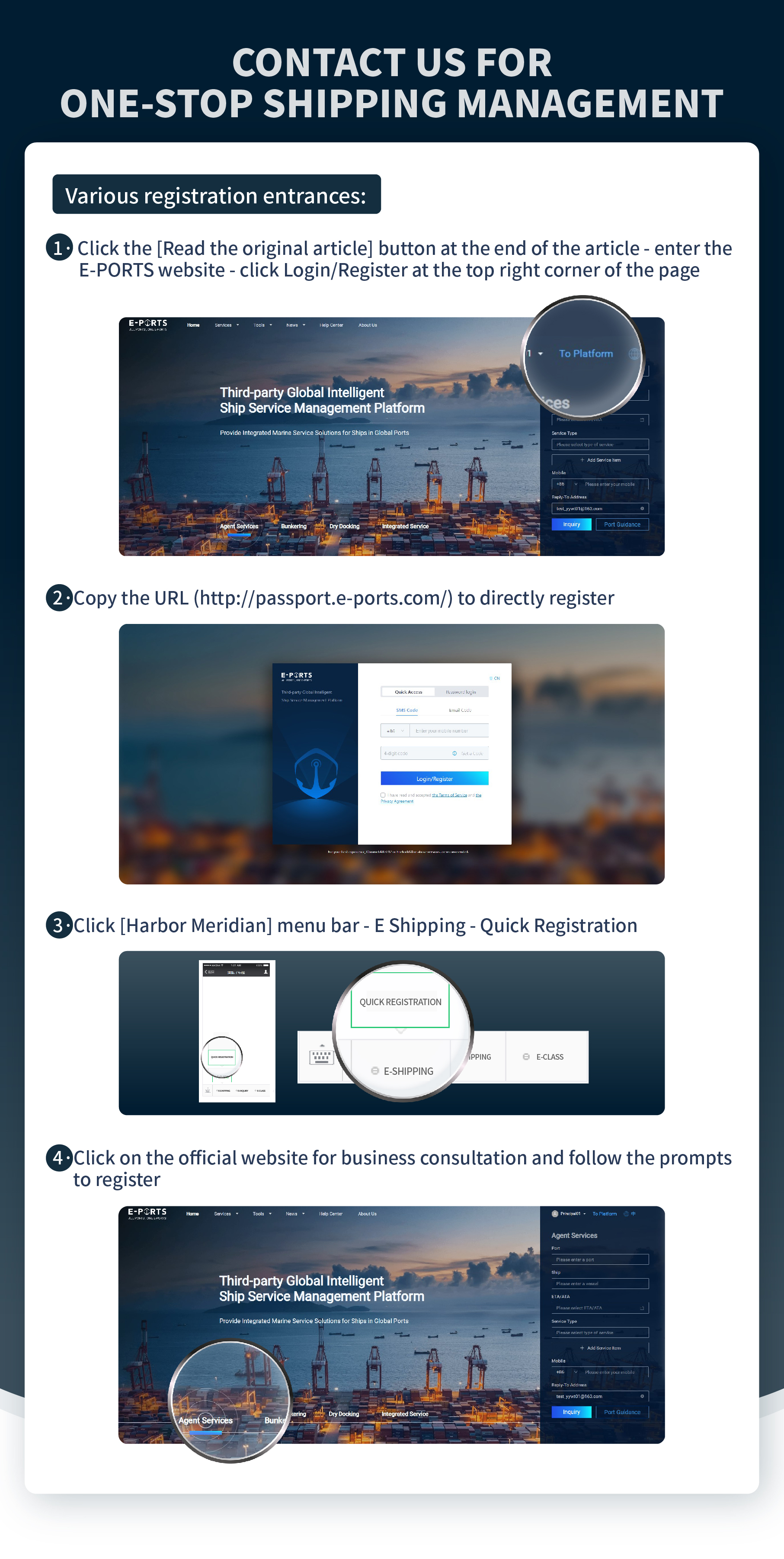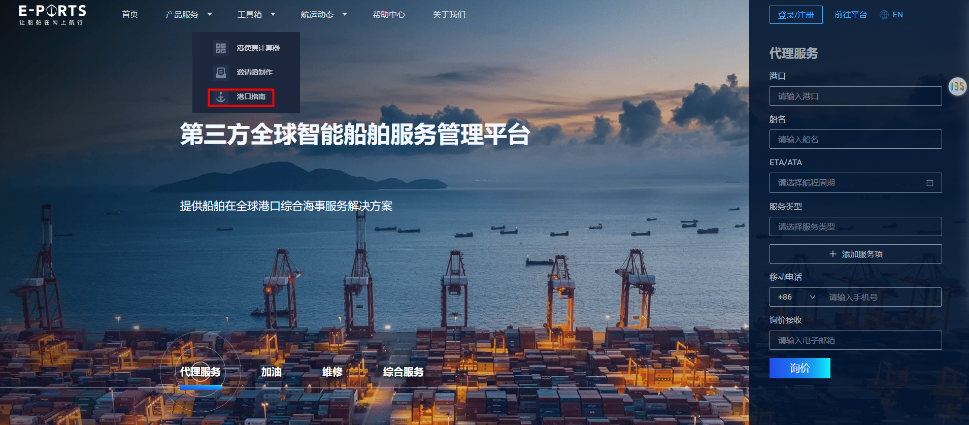 2: E-PORTS is a professional shipping agent platform cooperating with over 85% of ports in the world. So, we can offer you real-time port information and solutions online to make sure your vessels can arrive on time and to reduce your extra expenses incurred by demurrage if your vessel will delay.